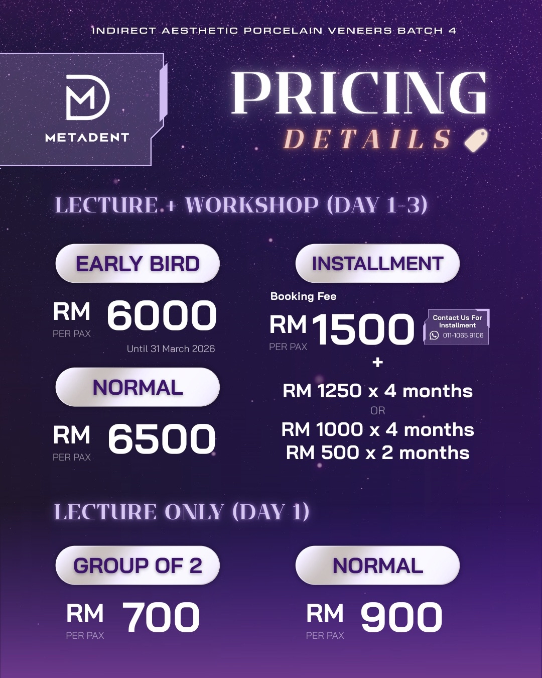 Installment (6 months): RM1500 Booking Fee + RM1000 x 4 + RM500 x 2 = Total RM6500/pax